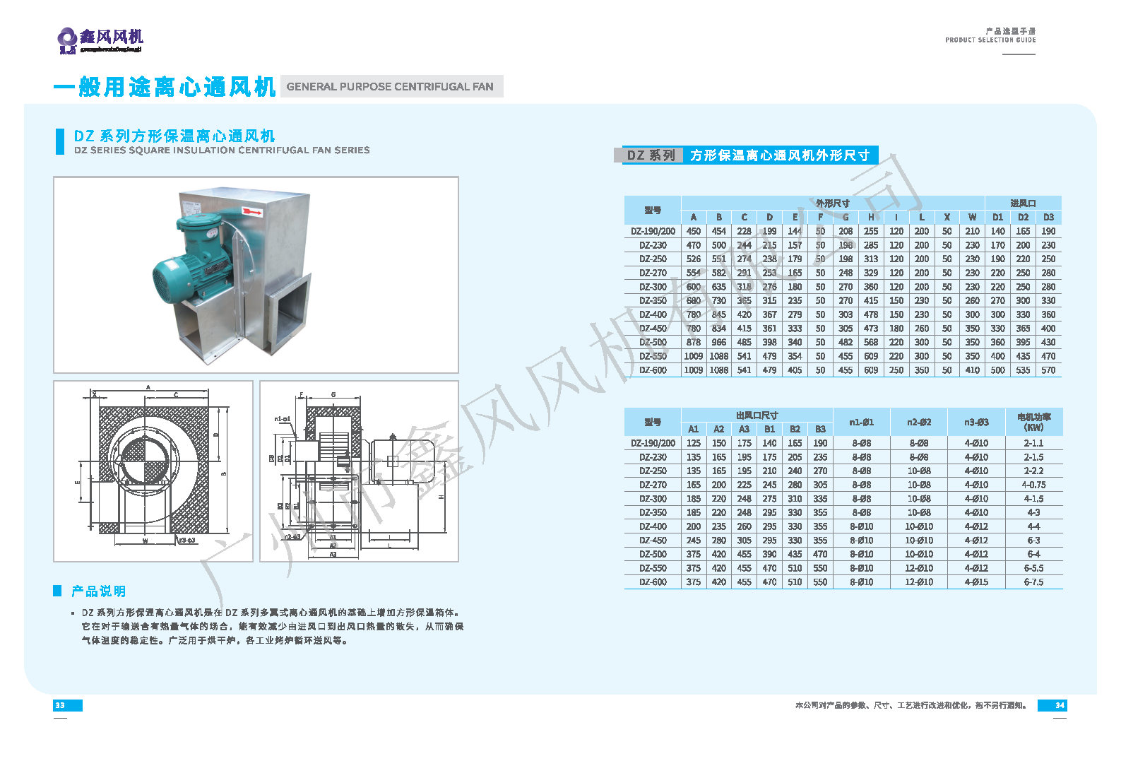 DZ方形保溫離心通風機系列是在DZ系列多翼式離心通風機的基礎上增加方形保溫箱體。
